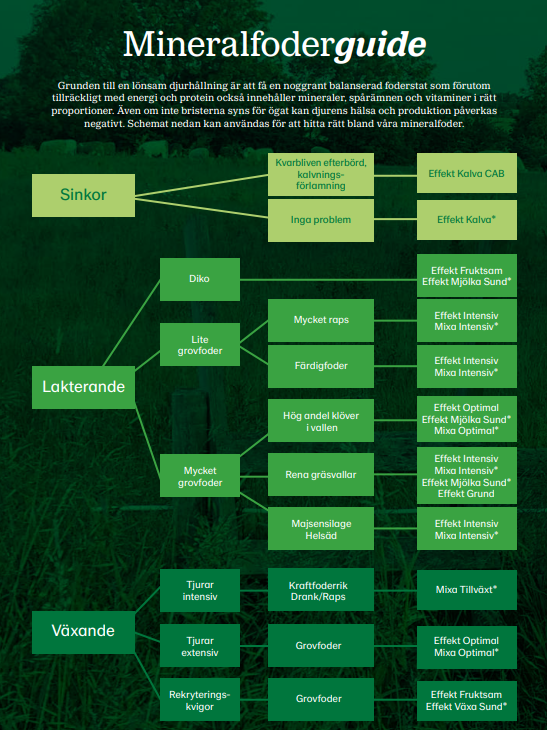 Vi har ett brett sortiment av smakliga och optimerade mineralfoder. Sortimentet innehåller såväl basmineralfoder som specialanpassade sorter för olika djurkategorier. Effekt mineralfoder är granulerade. Våra Mixa mineralfoder håller samma höga standard som våra Effekt, men rekommenderas främst för utfodringssystem med blandarvagnar.