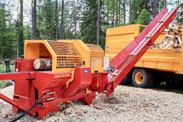 Duuns traktordrivna vedmaskiner har en kompakt konstruktion i höghållfast stål. Det ger extra slitstyrka till de snabba och driftsäkra maskinerna samtidigt som utmatarbandet blir både lätt och stabilt.