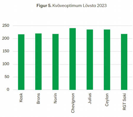 Kväveoptimum är relativt högt även ett år som 2023 med en variation mellan 200-245 kg N per hektar på platserna Svalöv samt Lövsta och något lägre på Kölbäck.